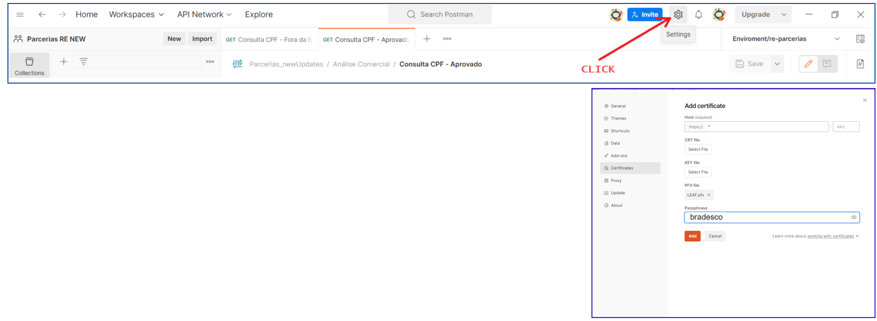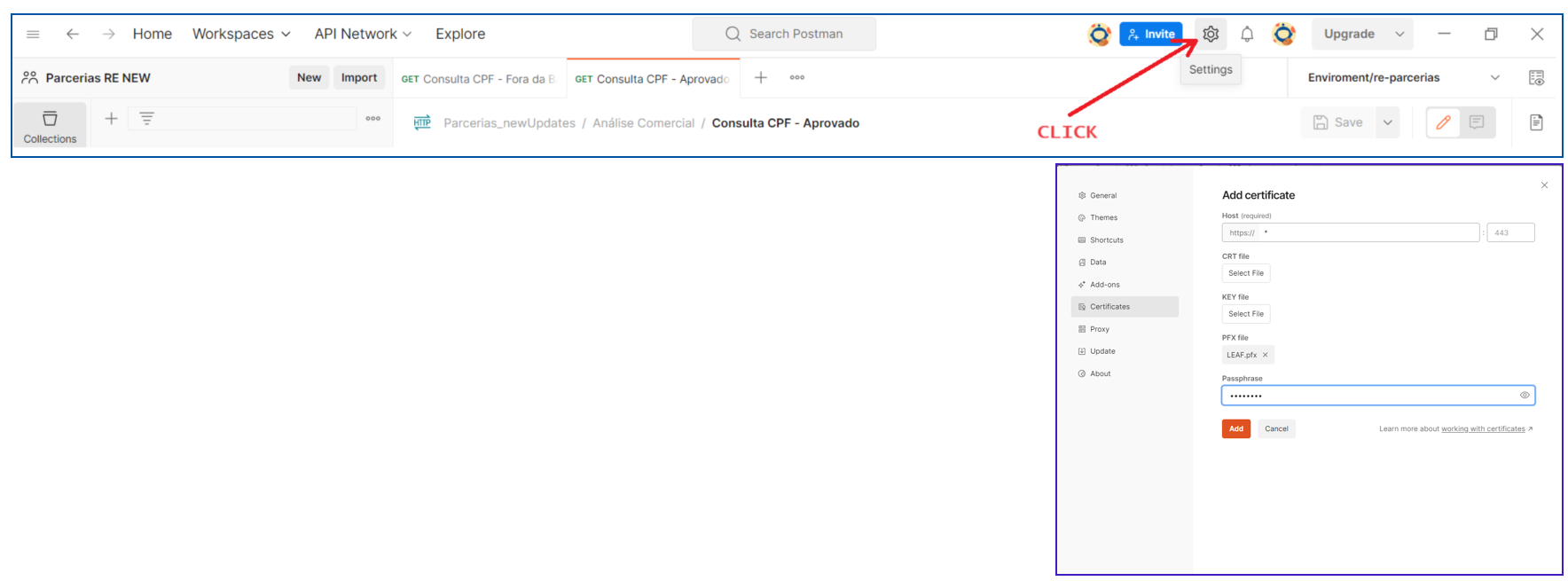 Exemplo de configuração do certificado (lado do parceiro) na ferramenta POSTMAN: