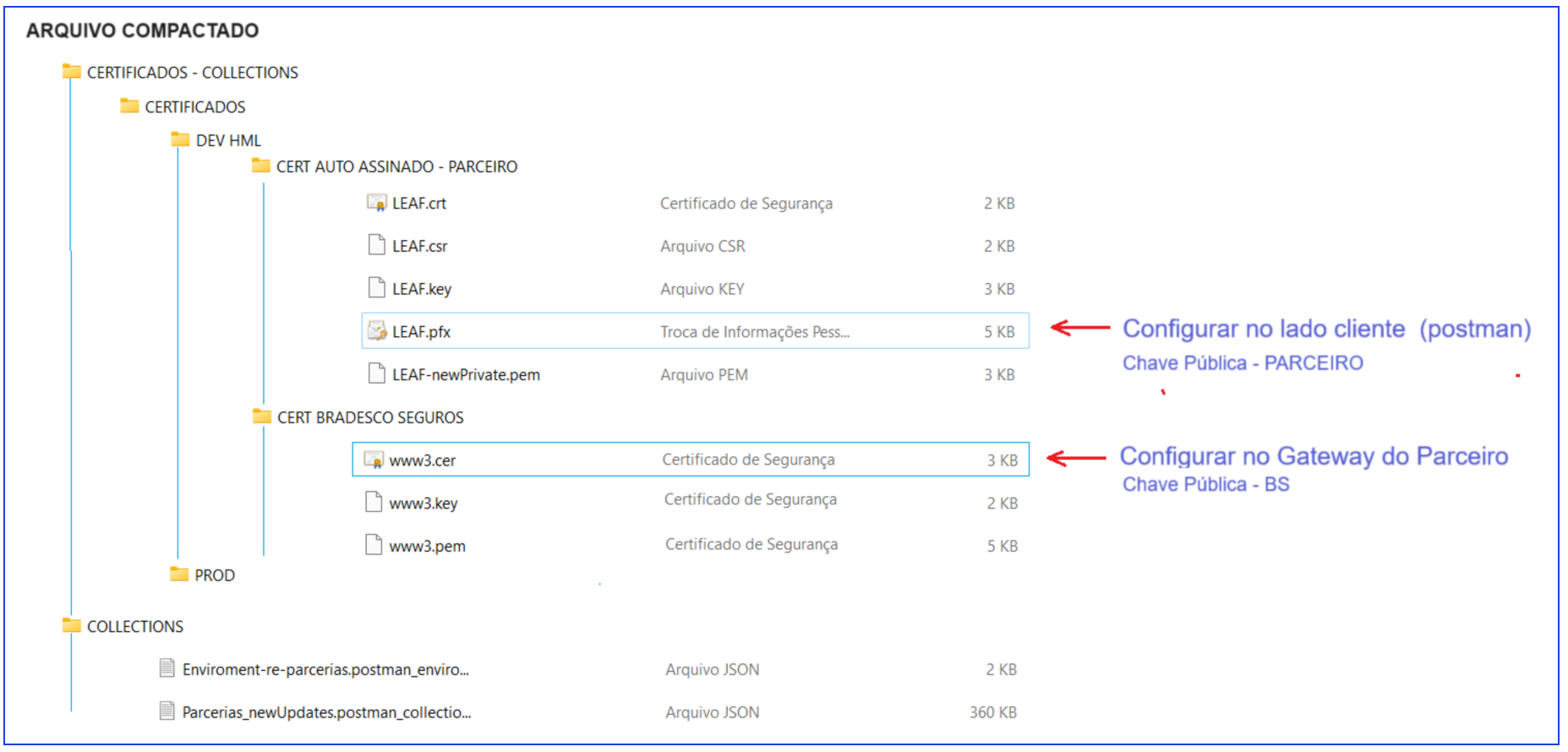 1. Time de TI-Security do Parceiro encaminha o CERT-Parceiro para o time TI-Security da Bradesco Seguros 2. Time de TI-Security da Bradesco Seguros encaminha o CERT-BS para o time de TI-Security do Parceiro 3. Ambos instalam e configuram os certificados em seus respectivos gateway